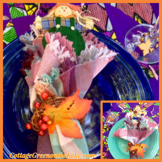 Generous sized napkins with frayed edges (like the tattered clothes of the scarecrow!) are slipped into my DIY mini-grapevine napkin rings (click here for DIY autumn napkin rings) and have a charming little scarecrow adornment, tucked among the layers of napkin. Remember the cute DIY autumn drink markers we learned how to make? See where I have clipped them around the base of each stemmed glass to add some seasonal flair to my autumn setting. (Click here for DIY Autumn Leaf Drink Markers)