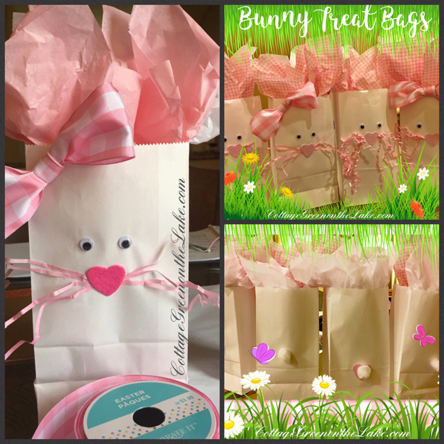 These “Big-earred Bunny Bags are so cute and take just a few minutes to make! They are reinforced paper sacks and hold lots of Easter goodies, dyed eggs, jelly beans, cupcakes, Peeps, Chicks, and sugary treats! I bought my treat bags, pink and white gingham ribbon, tissue paper, felt hearts, pipe cleaners, and googly eyes at Michael’s. (Tip: I used my glue gun instead of Elmer’s Glue-All to make my assembly time faster!) Plus, I also used a pair of scissors and a ruler.