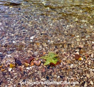 A lone Sycamore leaf drifting along in the crystal clear waters.