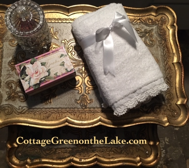This charming duo from Italy will look perfect in our “almost finished” upstairs bathroom. (Reveal coming!) A pair of crocheted hand towels ribbon-ed together, a luxuriant bar of Gardenia scented soap, and a medley of dried rose petals, lavender, chamomile buds, lemon grass, orange peel, and hibiscus petals fill a crystal biscuit barrel and sit atop the ornate tables.
