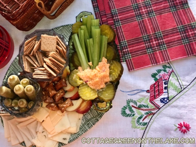 With my charcuterie platter ready, I gathered up a few more pieces of charm … an antique table runner trimmed in red, sprinkled with red daisy’s, and dear little cottages … a red plaid thermos to hold our tea … and tartan red napkins fit perfectly in our grand daughter’s miniature wicker picnic basket.