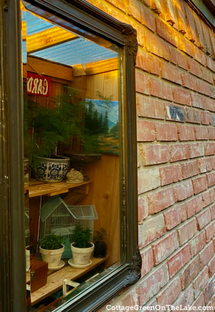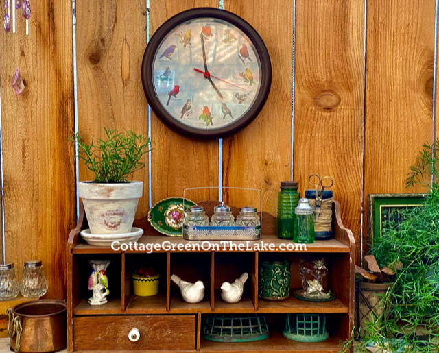 This battered, old cubby holds all kinds of fun garden paraphernalia and the rosemary planter fits right in among my collection of floral frogs and antique salt and pepper shakers. The Depression Glass green shakers are my favorites with their shabby little screw caps that are dented and worn. They all look pretty and winsome sitting about, but they are dual purposed and make great containers for tiny things. I use them in the Cottage Greenhouse to store the seeds I gather from my flowers and trees.