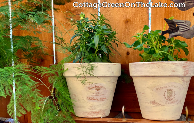 As soon as the Mod Podge was dry, I took my little pots out to the Cottage Greenhouse, sat down at my potting table and began filling them with potting soil. I did have a rosemary plant to plop into my first container for future plates of spaghetti, and though I didn’t have a peppermint plant, yet (I have one ordered) I was happy I had a snapdragon loaded with buds, and 2 golden orange pansies that were waiting for my new containers.