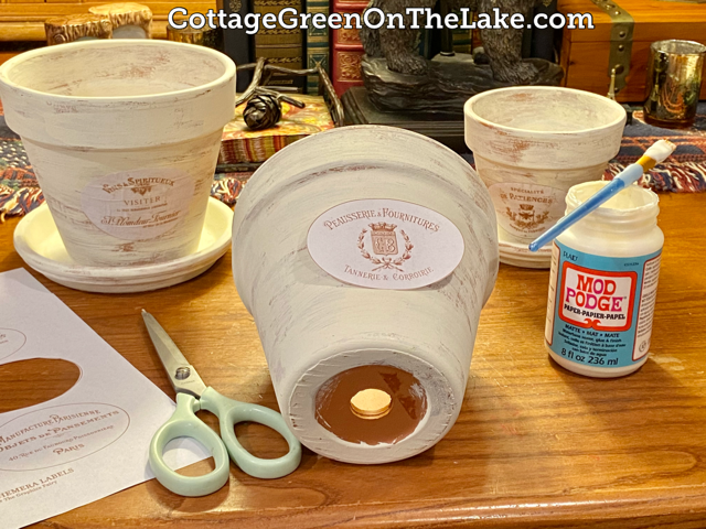 6. Cut out desired French label and apply Mod Podge to the back of the label and adhere the label to the planter