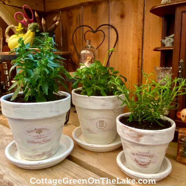 My shabby chic white-washed French planters that only cost me a $1.48 each! Fill them with fresh herbs and they would make delightful Valentine’s Day gifts for your friends and neighbors! To make things even easier for you, most grocery stores keep live herb plants stocked in their Produce Section. I ordered my live rosemary plant when I made out my Wal Mart grocery order and it was only $2.98 ! (P.S. I have already added the Mint and Basil live herbs to my shopping cart for my next on-line order!)