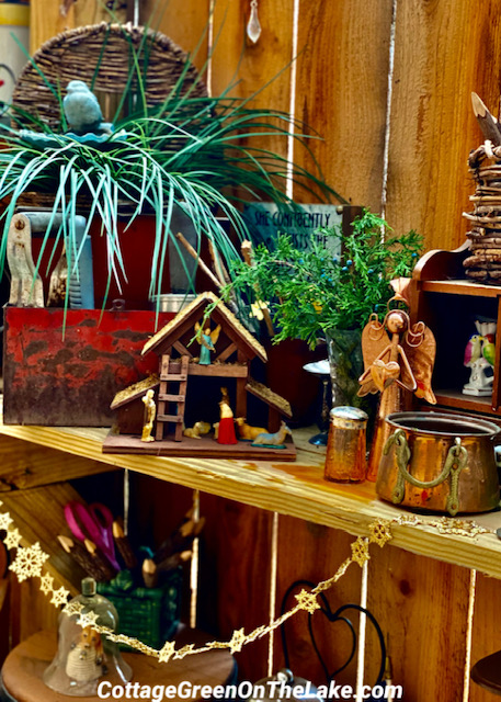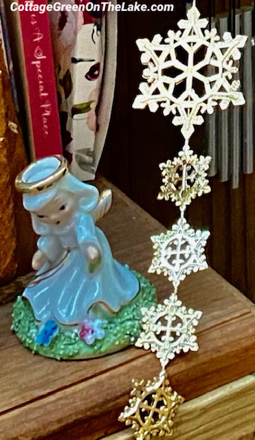 My treasures included a golden snowflake garland I draped along the potting shelves…