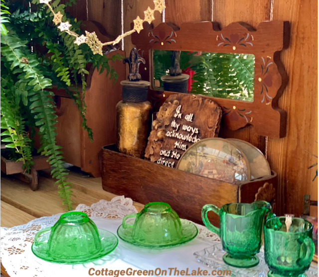 After adding those bits of Christmas whimsy to the greenhouse, I decided to set the potting table for a simple afternoon tea. I was brimming with fanciful ideas, that day, and with the enchantment of Christmas. The sweetest set of green depression glass teacups and saucers, etched with poinsettia’s were the perfect tea service for a Greenhouse Tea Party.