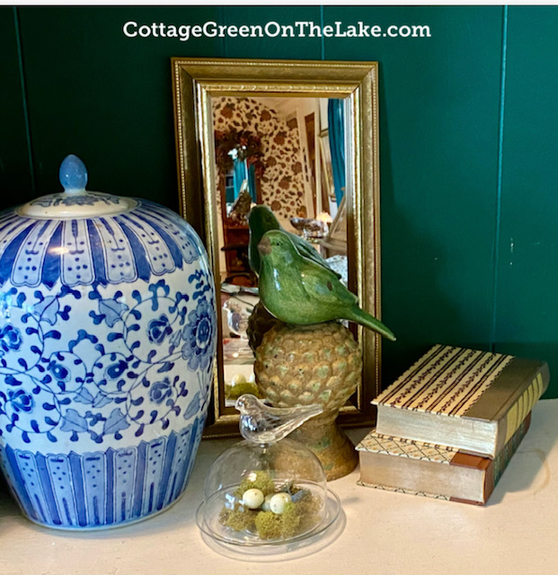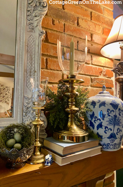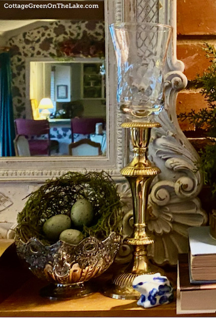 An antique ceramic parrot, old books with browned, ruffly pages, and another little bird nest perched in a silver cup with intricate edges, mix beautifully with the large mirror over the fireplace, brass candlesticks, blue and white porcelain, and a mirrored frame of birds…and bring the look of Spring to the mantle.