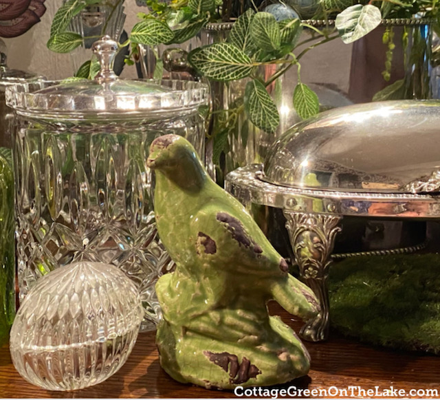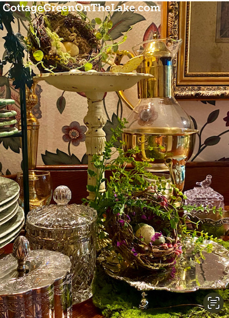 Plates, an elegant coffee carafe with pedestaled server, a crystal biscuit barrel, and a silver tin…mix beautifully with a rustic iron birdbath, twiggy nests, bright moss, and bird eggs. The same “rustic elegance” theme continues…and “fancy stuff” is right at home amongst bits of spring, and pieces of the outdoors.
