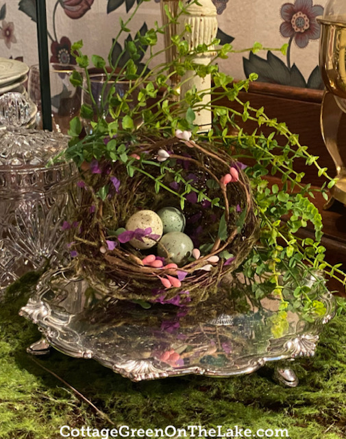 I love serving our desserts and coffee from our antique dining buffet, and after I completed setting the table, I began decorating and setting the buffet with the same theme of Rustic Elegance in mind. I mixed and blended silver and crystal with ceramic birds, moss and spring leaves, and lots of little bird nests filled with eggs.