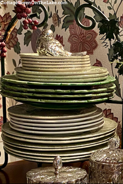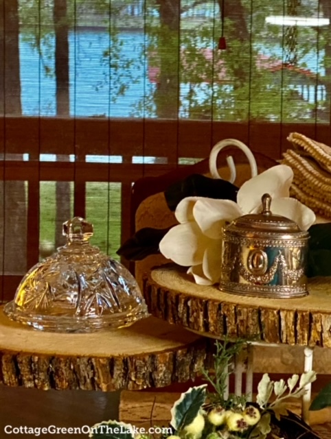 A silver box and a domed glass butter server look even more elegant perched on their wooden platforms. The wood rounds were a special gift that my son and daughter in law gave me for Christmas.