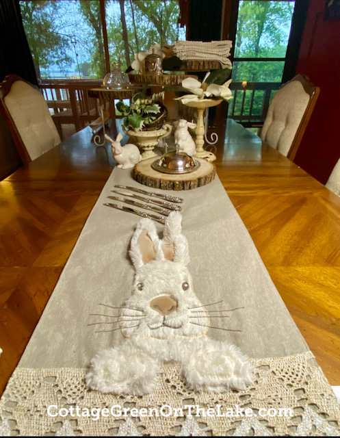 April quickly blended into May and this weekend is Mother’s Day! Our tablescape, with it’s bunny theme, was perfect for Easter and all our April birthday’s, but is easily adaptable and can be used for Mother’s Day, also… a white Battenberg lace runner will replace the bunny table runner and the ceramic bunny’s will be put away until next year and exchanged for a beautiful, antique “Lady’s Head” vase filled with flowers.