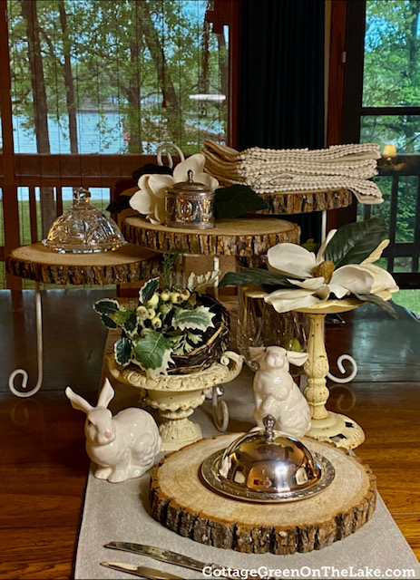 “Adopting the pace of nature” I began setting our table for Easter, and the 5 Family Birthday’s we have in April. I thought a buffet style tablescape would be the most convenient way for everyone to serve themselves, and it seemed to come together easily as I collected the items I wanted to use…an iron bird bath, creamy Magnolia blossoms, natural wood rounds, a 3-tiered iron serving piece, white porcelain bunny’s, a chunky urn with a little bird nest inside, and some silver and crystal for sparkle; my favorite mixture of rustic elegance.