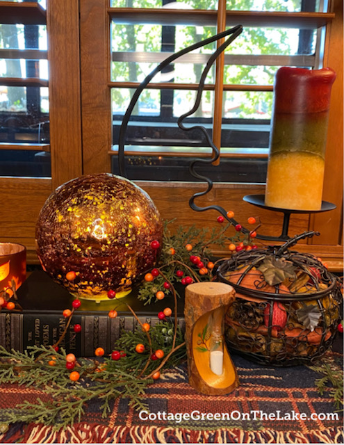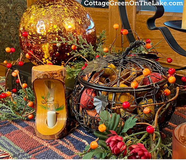 A wire pumpkin filled with potpourri ties in with the autumn theme and repeats the wrought iron of the moon. A cedar timer from Colorado adds a woodsy feel and is a dear souvenir that belonged to my mother and father and brings back sweet, remembered times.