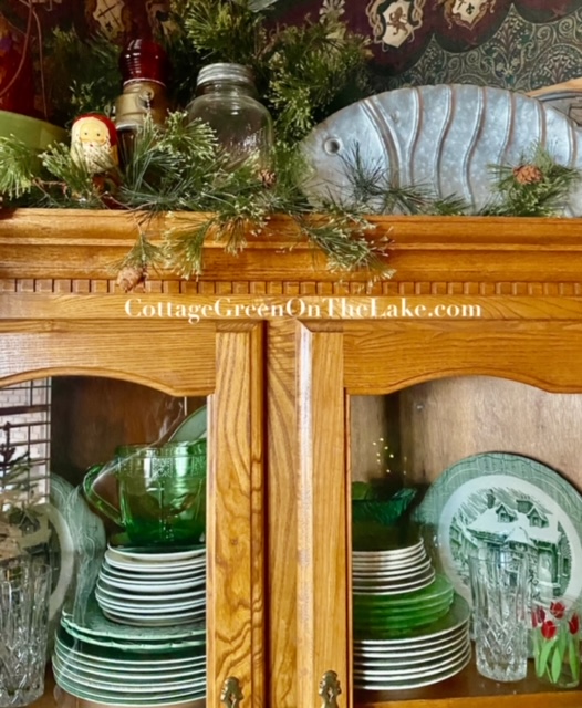 Kitchen cupboard filled with Old Curiosity Shop Green Transferware “Merry Old England, Charles Dickens.”