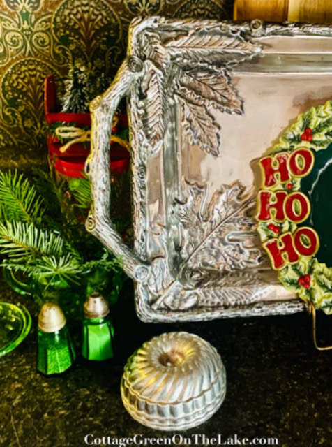 HO HO HO vignette in the kitchen with pewter tray, tiny bundt cake pans, and depression glass