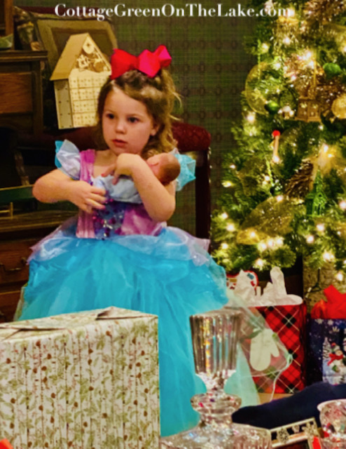 Our youngest Darling wearing her new Princess gown that Grandma and PaPa gave her for Christmas…cradling her new baby doll.