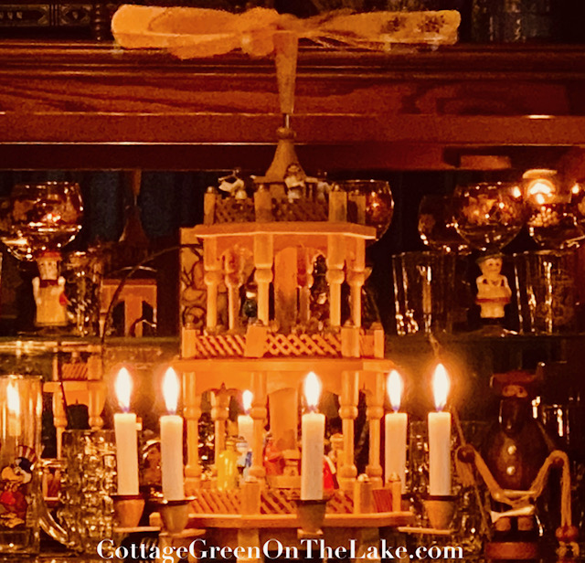 We bought this Christmas pyramid when we lived in West Germany from 1983 – 1986 when we were visiting one of our favorite towns, the medieval town of Rothenburg ob der Tauber in the Bavarian region of Germany. Angels, wise men, and shepherds circle around Mary, Joseph, and Baby Jesus. The circling carousel is propelled by the heat from the candle flames.