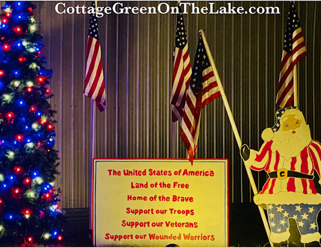 Red, white, and blue Santa Claus and light display honoring our military. Land of the free, because of the brave. ❤