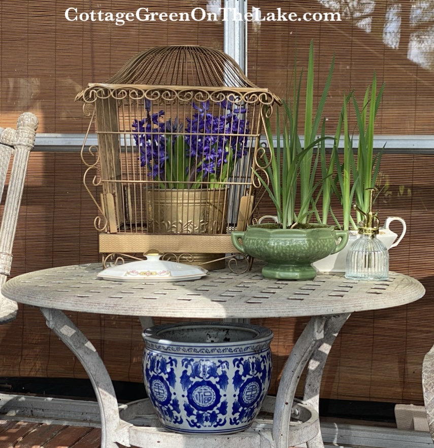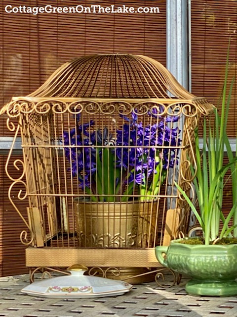 This last darling arrangement was a sudden inspiration when I was looking for another container to put these gorgeous hyacinths into, and saw this golden birdcage I have displayed in my greenhouse. I placed my pot of hyacinths into a gold planter, so it would match the bird cage…slipped the tray out of the bottom of the cage…placed the hyacinths under the bird cage…and voila! an instant, whimsical spring arrangement! I can hardly wait for the wild iris to bloom to see their deep purple blooms next to the purple-blue flower of the hyacinth!