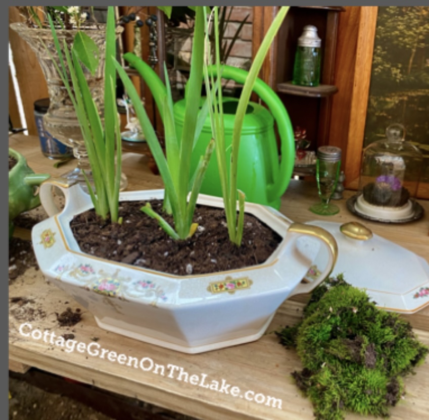 I took the bulbs into the greenhouse and from my collection of vessels and flower vases (click here to see) selected a soft-white, French, vegetable tureen, trimmed in gold, and circled with tiny flowers. I found this tureen recently at a flea market for only $3.00 and have been anxious to use it!