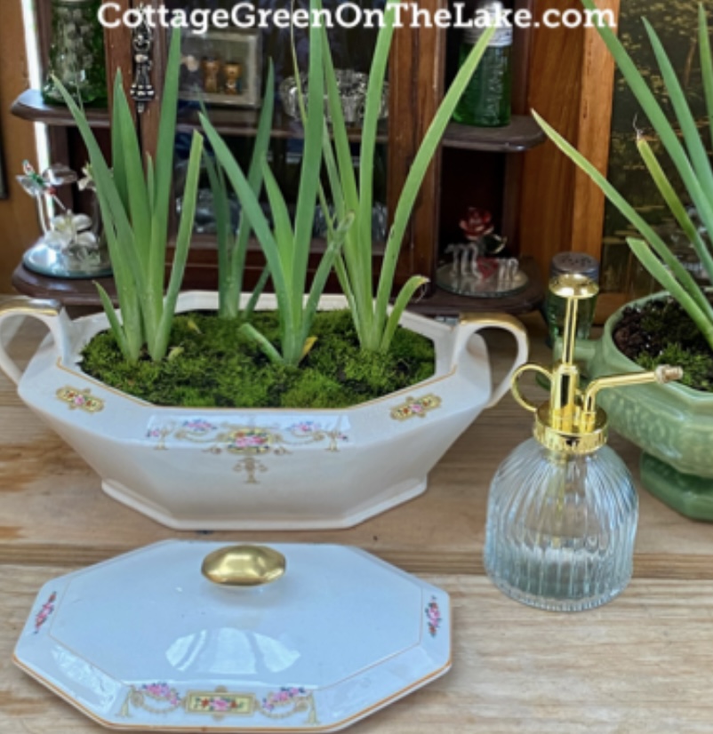 I collect all kinds of vases, dishes, and ornate bowls for flowers, but If you don’t have a collection of containers, search in your cabinets, use your imagination, and look at what you do have…gravy dishes…sugar bowls…soup tureens… teapots…bowls…baskets…(I even used a birdcage!) and repurpose them as planters. Side note: If you find the perfect vessel to use, but still want to use it again for serving food…line the inside of your dish with foil, then put a thick freezer baggie (or use 2 thinner baggies) into the container. Fill the baggie carefully with potting soil while it is in your dish or container so it will form to the shape of your vessel. Trim away the excess baggie, making sure to leave enough of the baggie above the soil, to tuck the edges of the baggie into the plant receptacle or, instead of tucking the trimmed baggie into the planter, leave the trimmed rim of the baggie, to “collar” or peek above the top of your container. Plant your bulbs or flowers in the potting soil. Water lightly, making sure you don’t over-water, since your vessel does not have a drainage hole.