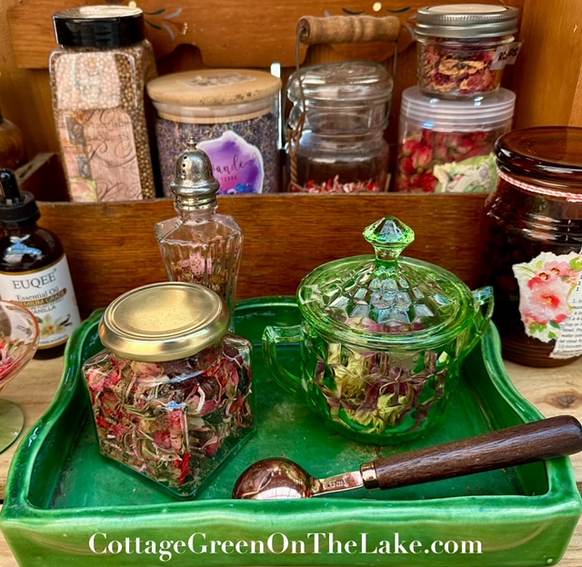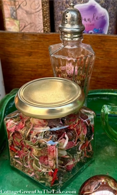 Making my own potpourri sparks my creativity and I feel especially resourceful when I use the flowers and spices I’ve grown…then I search for the perfect potpourri container from my cache of antique and thrift shop finds! Antique sugar bowls…a dainty sherbert cup…chunky pottery bowls…a crystal candy dish…or a woven basket are all perfect receptacles for potpourri. (*If you use a basket for displaying potpourri, be sure to line the bottom and sides of the basket with wax paper, or parchment paper so the essential oils on the potpourri won’t stain or seep through the basket.)