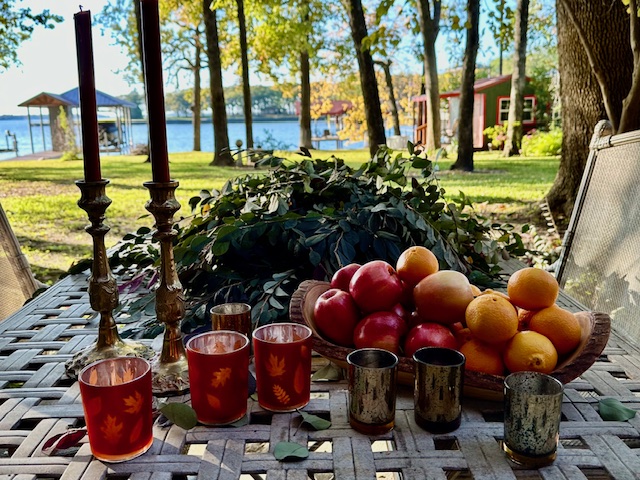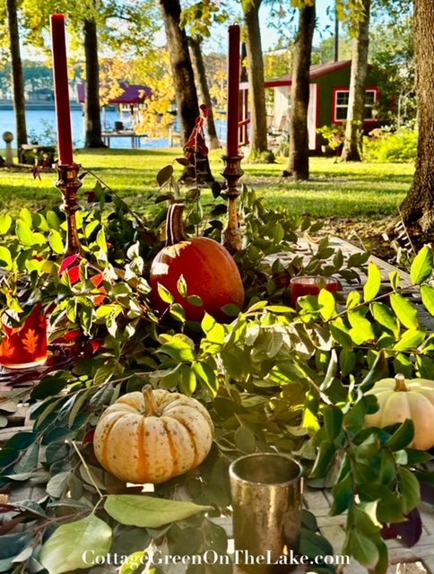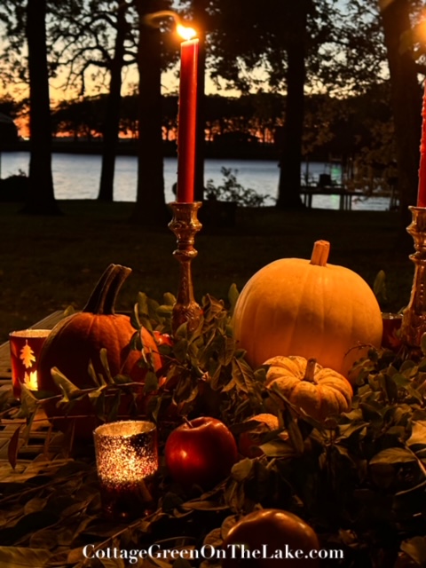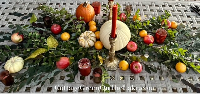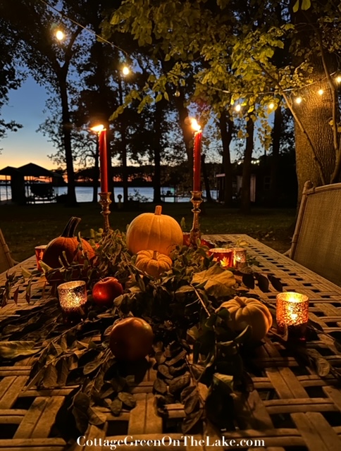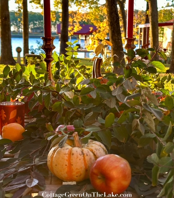 Today was another beautiful November day and the perfect day for assembling a centerpiece for our outside table. The centerpiece splays across the table and is made up of “twig-ery and poke-ery” and other autumn finery, and candlelight twinkles over the tabletop. An outside dining area easily becomes an extension of your living area and an enchanting way to beckon company outside.