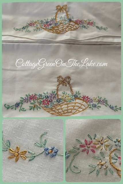 The needlework on these pillowcases is exquisite and must have taken some dear person many hours to complete. Both cases are in pristine shape and don’t have any tears, holes, or aging, plus have no signs of ever being used! I can hardly wait to wash them in Oxy Clean Laundry Whitener (great for washing antique linens) and slip them over the pillows in the bedroom upstairs I affectionately call “The Feathered Nest.” (: