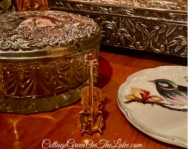 Trying not to get my hopes up, I timidly opened a little Swarovski crystal box I spotted on the shelf of an estate sale. I’m a violinist and I was enchanted when I saw this tiny, crystal violin inside. Swarovski crystal violin and golden stand – Cost – $4.50