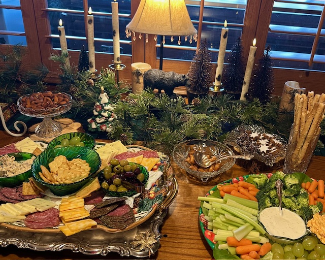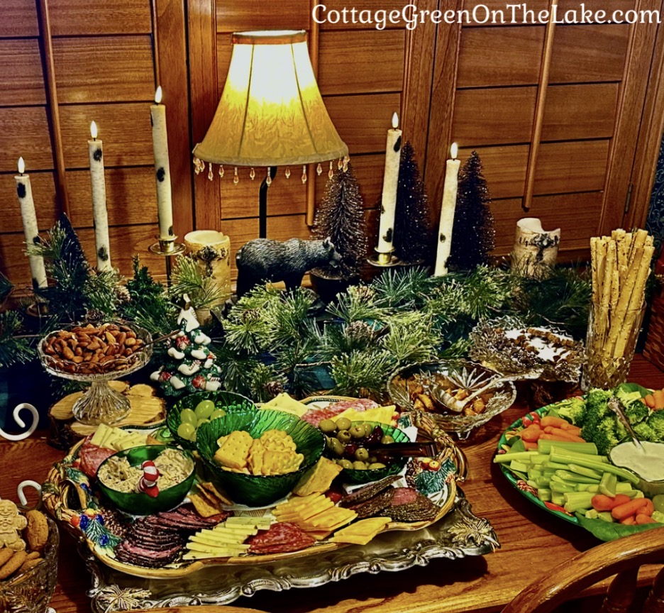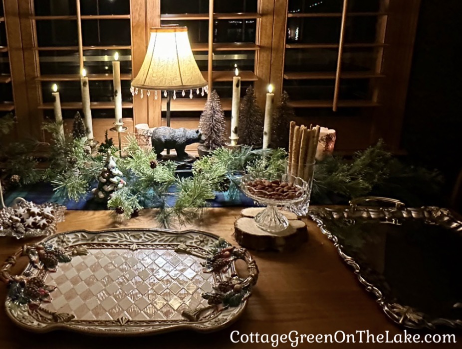 I chose this platter, embossed with leaves and pine boughs, and a large silver tray for our forest themed buffet and snacks.