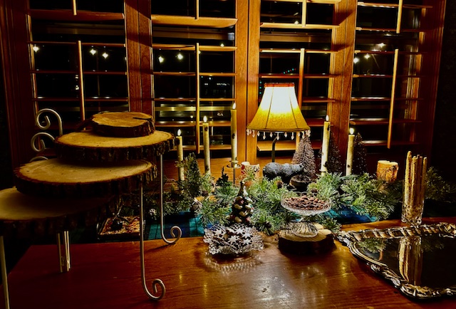 To augment the woodland theme, I placed rustic, wood slices on this quaint stand and put all our paper plates, napkins, and cutlery, “going up the stairs”…easy to see and for everyone to serve themselves! Smaller, cedar rounds on the table act as pedestals for decorative bowls that hold gingersnaps, star shaped cinnamon cookies, peanut butter filled pretzels, and almonds.