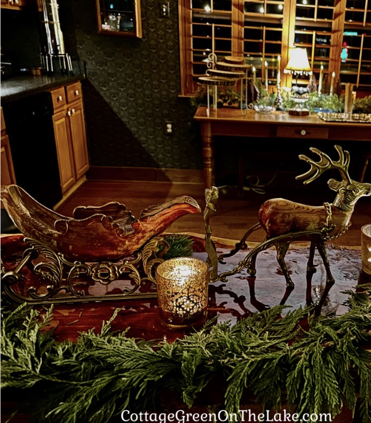 A blue and green tartan runner topped with a garland of pine…bottlebrush trees shimmering with copper glitter…cedar rounds on a staircase stand…and glowing, birch candles seem to reflect the mood of the winter night beyond our window.