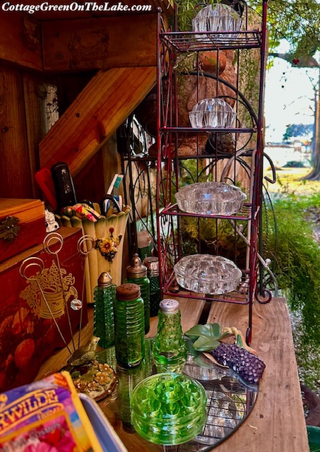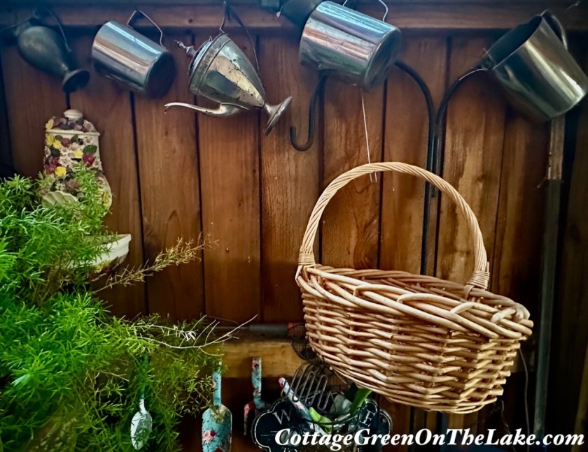 My “playhouse” filled with collectibles and garden tools…an enchanting little hideaway with the smells of cedar walls and earthy things, birds twittering in the background, and a view of the lake through the open door.