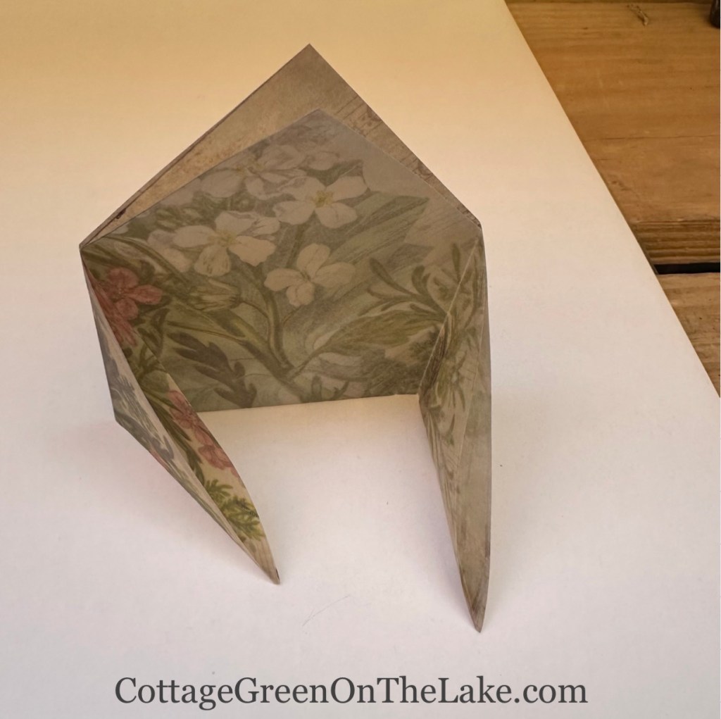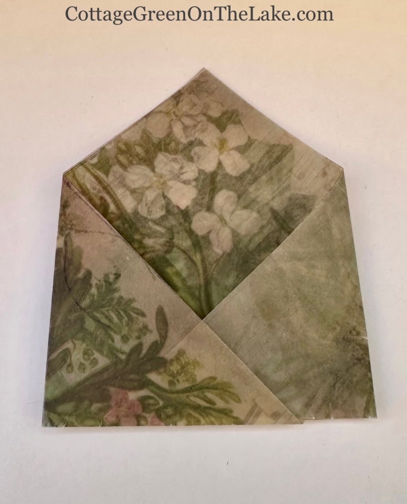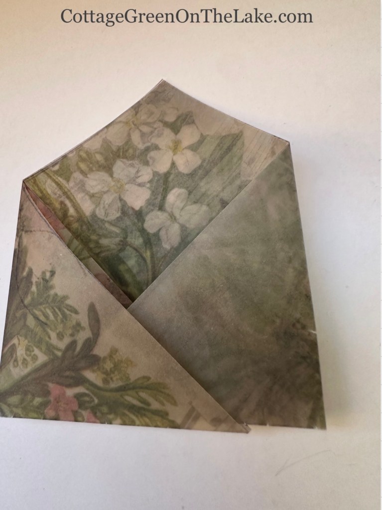 Grasp either bottom corner of the paper and insert the pointed end of the paper inside the opposite corner pocket…making an envelope (See pictures below)