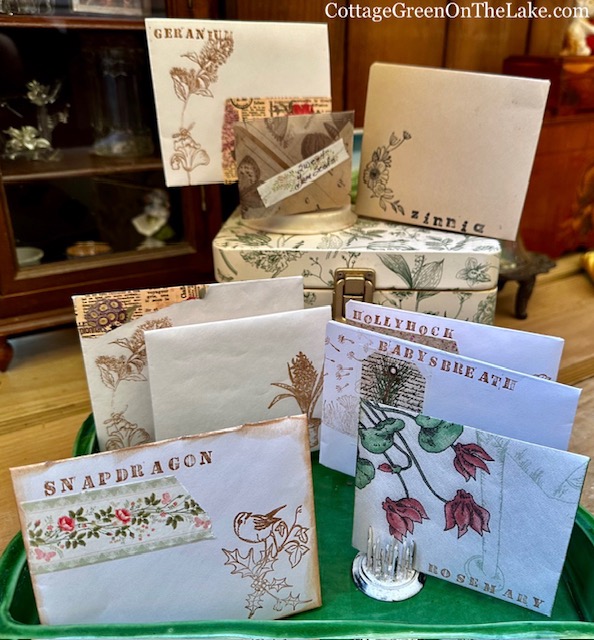 These charming seed packets were so fun and easy to make! I hope you’ll try making some yourself. I’d love to see them! Just take a picture of your seed packets and paste your picture in the comments below or send your pictures to cottagegreenonthelake@gmail.com
