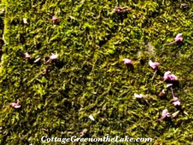 Redbud blossoms sprinkled on our pathway of moss