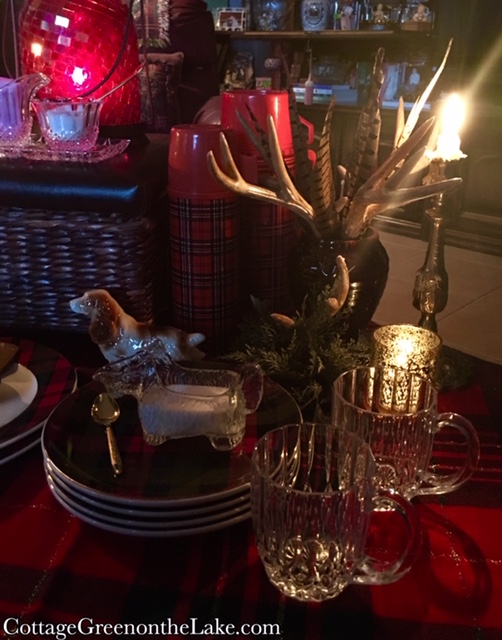 A pair of ornate candlesticks with scarlet tapers match the tartan cloth and a glazed pottery vase filled with pheasant feathers and faux antlers conjures up more Scottish flavor. Then, my favorite red thermoses add height, a perk of interest, and another layer of plaid, plus they’re perfect for keeping the tea hot … with two crystal mugs for “supping” close by!
