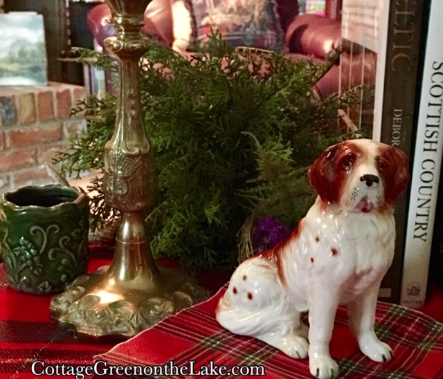 I gathered a basket full of “accouterments” for my tablescape that reminded me of Scotland … a beautiful antique Saint Bernard to sit atop tartan napkins looked stately in front of a pair of Scottish books.