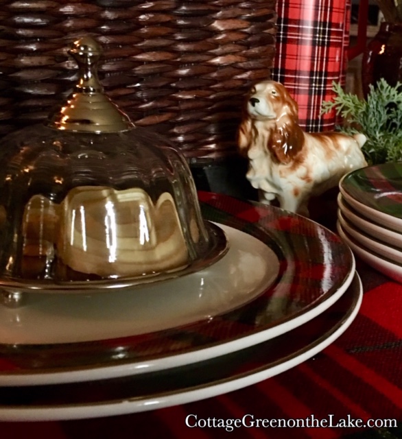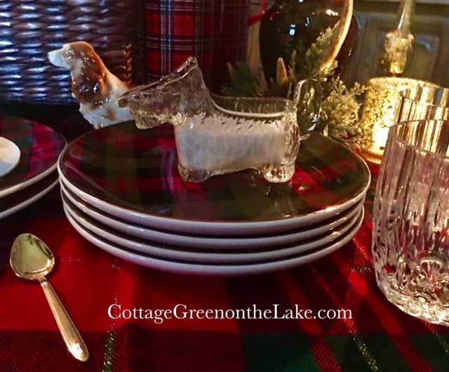 Since Scots are renowned for their love of dogs … another pair of sweet antique doggies for my tablescape; a ceramic Cocker Spaniel stands beside a glass Scottish Terrier that’s perched on a pedestal of tartan plates.