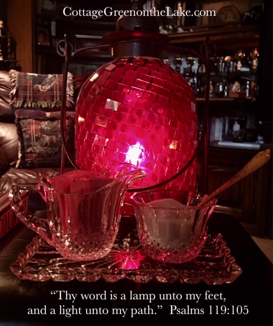 Then the last adornment’s to my tablescape … a leaded glass lantern (a loved gift from our daughter) and an antique crystal cream and sugar service glisten like jewelry atop a little wooden chest.