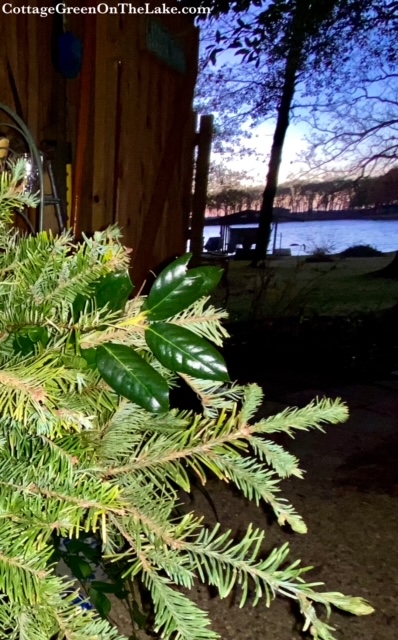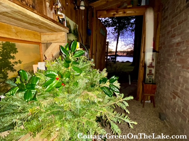 The fir boughs I was using I had saved and kept fresh in 2 big buckets of water in the greenhouse ever since Richard had trimmed them from our Christmas tree. I had plenty of branches to work with, but I still needed a little texture and color to mix in with my fir branches. Out into the backyard I went to forage with pruners in hand. I experienced a little thrill of resourcefulness when I found the perfect filler I needed…pointed, deep green, holly leaves with bright red berries from our very own holly bushes! I couldn’t help myself and began humming “The Holly and the Ivy” while I was clipping.