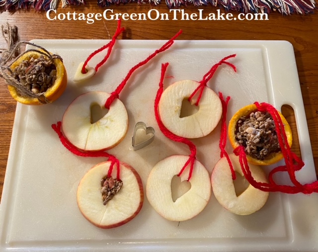 Next, I cut apple slices and used a mini cookie cutter to punch out heart in each apple slice. After the apple slices, I made sweet little orange cups and filled them with a mixture of peanut butter, corn meal, and bird seed.