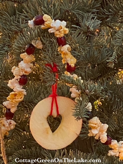 After I got through stringing my popcorn and cranberries, I cut a grapefruit, an orange, and a lemon into thin slices to dry in the oven and hang as ornaments and treats on my bird tree.