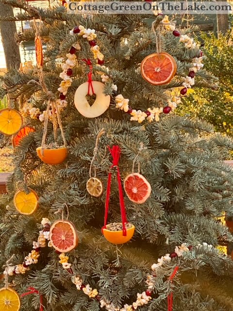 All the special treats for the bird feast were done and I hung them on what-had-been our Christmas tree. Strings of popcorn and cranberries, stained glass grapefruit, orange, and lemon slices, apple slices with little punched out hearts, and charming orange cups soon filled the tree. When I had finished, dear Richard, who always goes along with my whims, carried the whole tree up to the landing on our stairs where I could watch the birds from my chair. Just look how cute the tree looks perched up there!