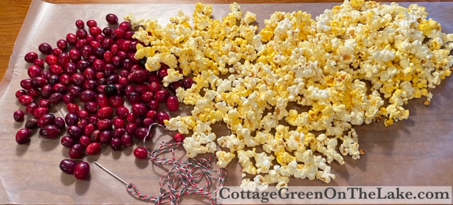 Then, this weekend SNOW was forecasted for us! It was the perfect time for another fun winter project I always enjoy doing, especially on a cold winter afternoon during NFL Wild Card Weekend; I made treats to decorate a tree for the birds! Click on the highlighted link to see another one of my posts about DIY bird treats… “A Picnic for the Birds” Since reading all the Laura Ingalls Wilder books when I was in elementary school, I’ve always wanted to string popcorn. Finally, after all these years, I decided to do it. Unlike Laura, who had to pop her corn over the kitchen fireplace, I conveniently got a bag of popcorn out of our cabinet and placed it in the microwave. While the kernels were popping, I set out some fresh cranberries I wanted to add to my popcorn string, found some cute red, green, and white cording to use for stringing, and a tapestry needle.